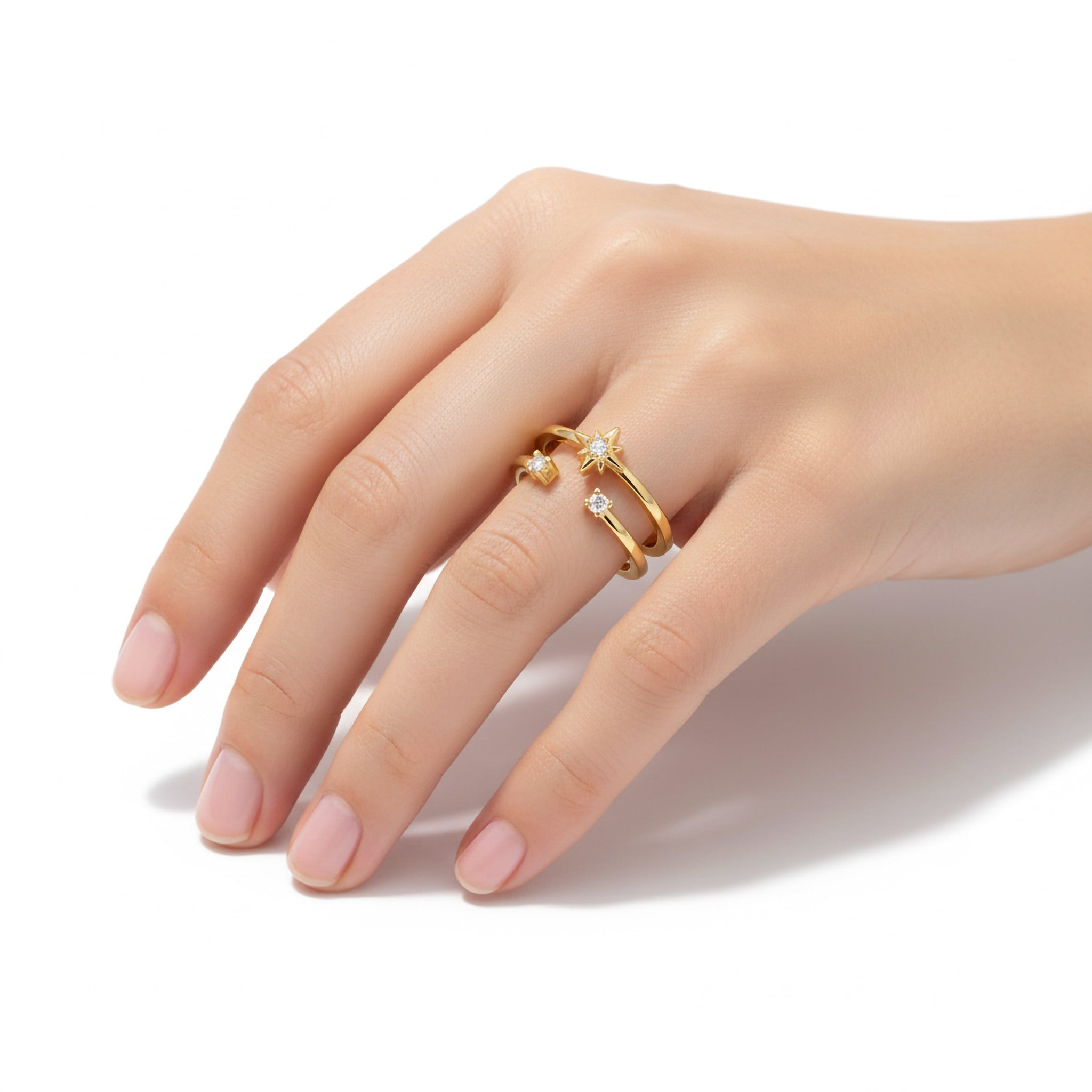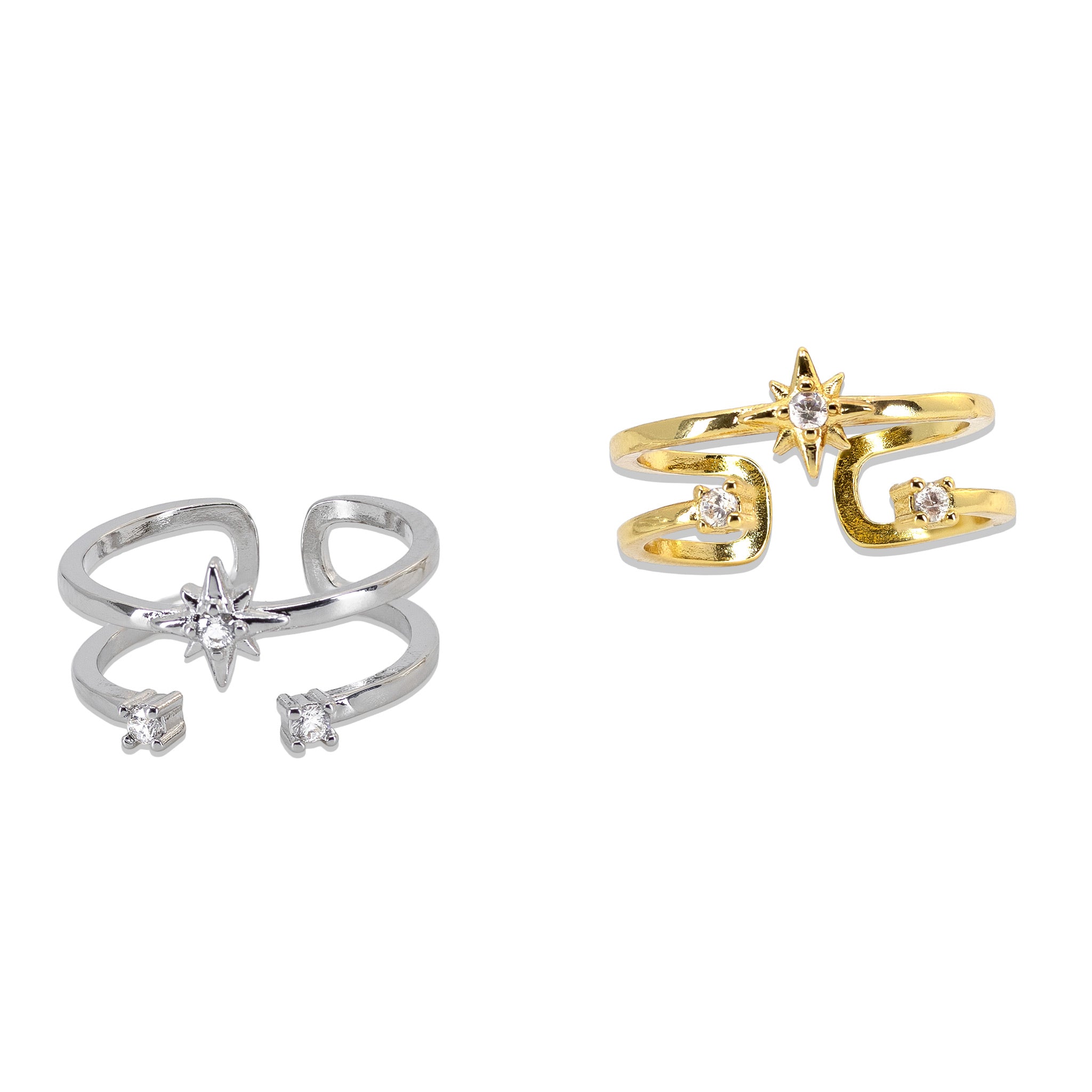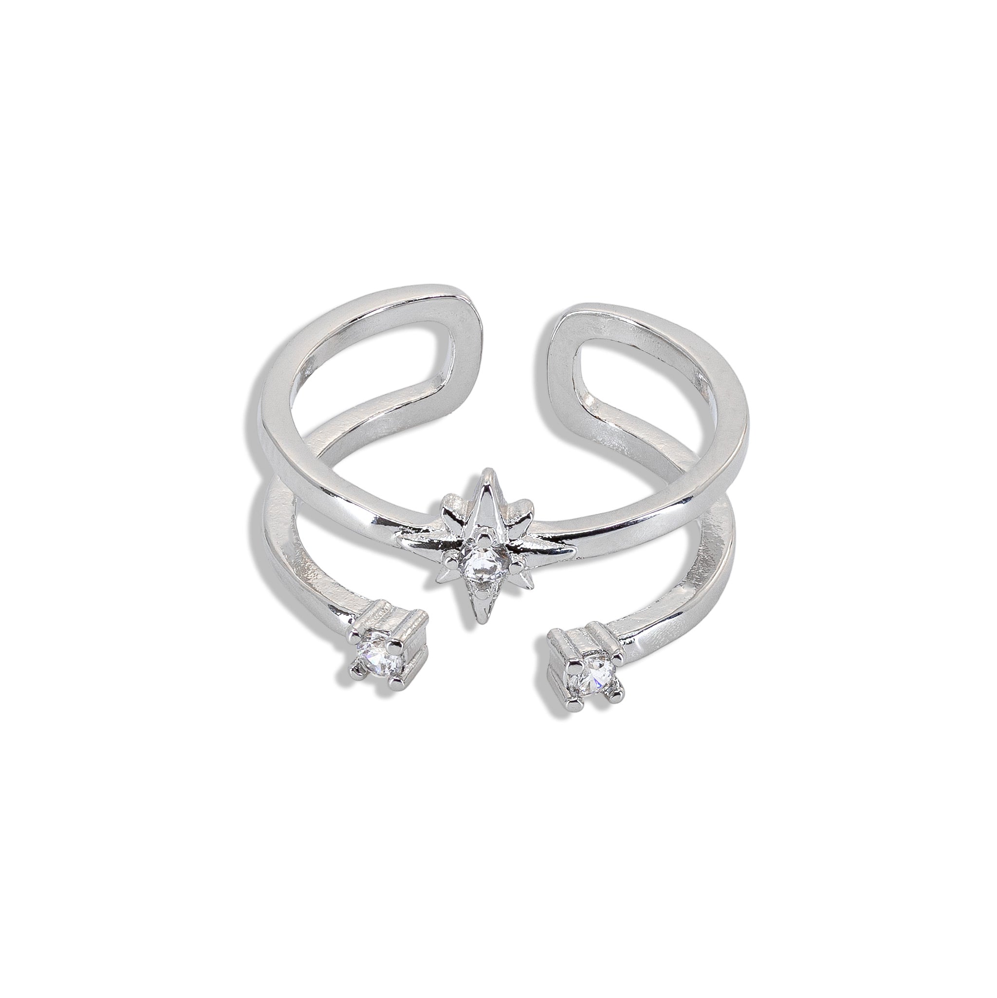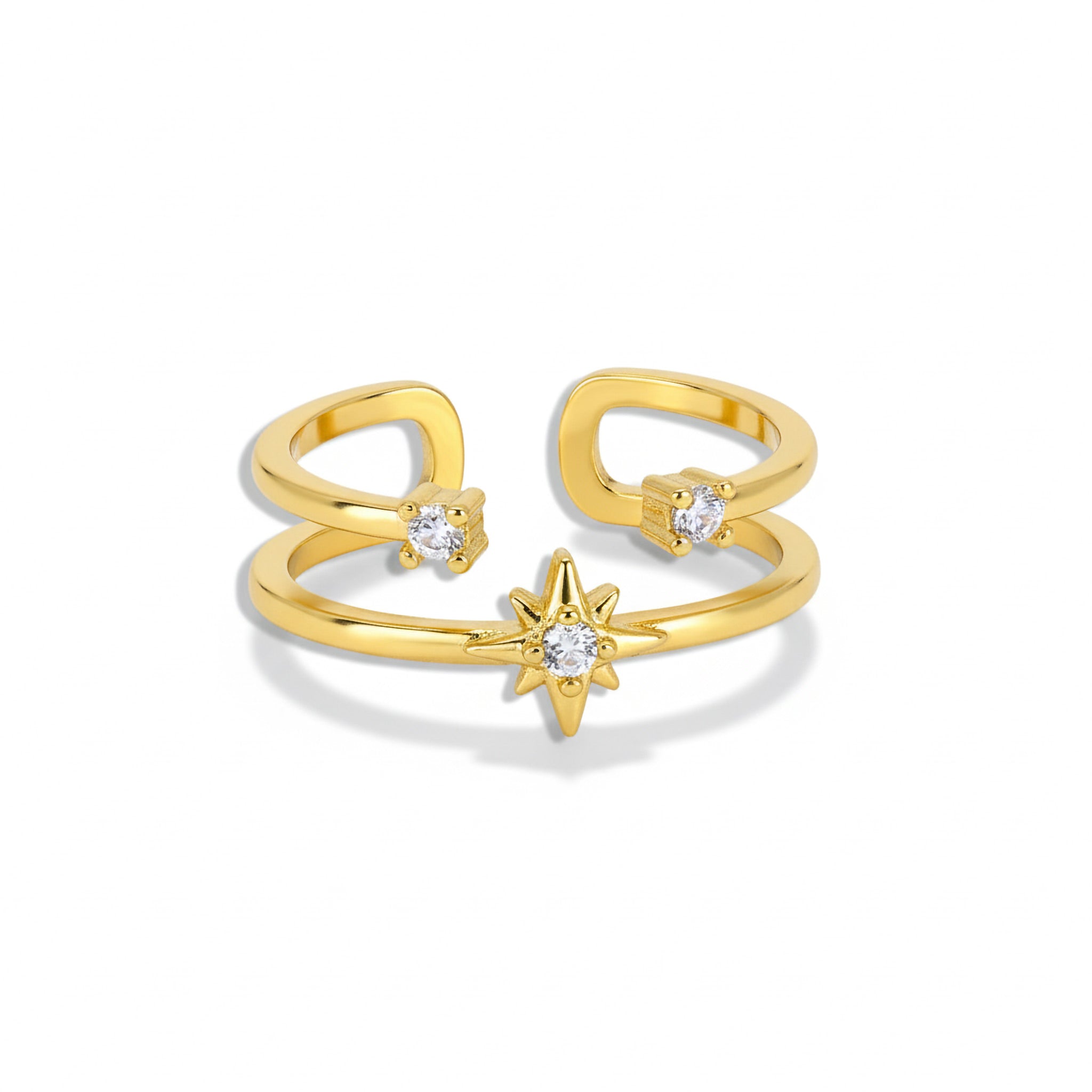 Dieser offene Ring spielt mit Balance und Spannung. Klare Linien treffen auf funkelnde Akzente und schaffen einen Look, der gleichzeitig reduziert und ausdrucksstark ist. Die offene Form verleiht dem Design Leichtigkeit und macht den Ring zum perfekten Piece für jeden Tag – solo getragen oder als Teil eines individuellen Stacks. Gefertigt aus Messing, wahlweise in Silberoptik oder mit hochwertiger 18K-Vergoldung, setzt der Ring auf moderne Eleganz mit einem subtilen Statement.