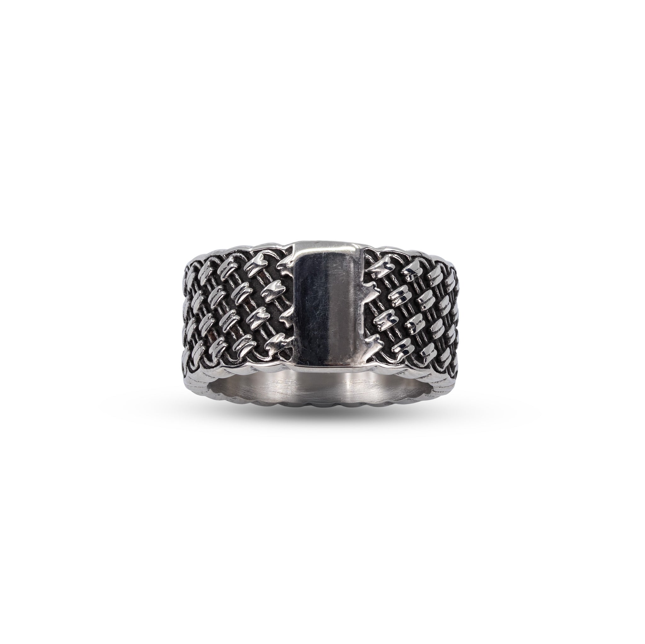 Hochwertiger Edelstahl trifft auf ein markantes Design: Eine strukturierte Oberfläche, die an ein dichtes Geflecht erinnert, kombiniert mit klaren, ruhigen Flächen. Kein lautes Symbol, kein klassisches Statement – sondern Tiefe durch Textur und Kontrast. Markant, aber kontrolliert. Dieser Ring funktioniert zu cleanen Looks genauso wie zu dunkleren, urbanen Styles. Perfekt zu Leder, Denim, Oversized Fits oder minimalistischen Outfits, wenn ein einziges Piece reichen soll, um dem Look Charakter zu geben.