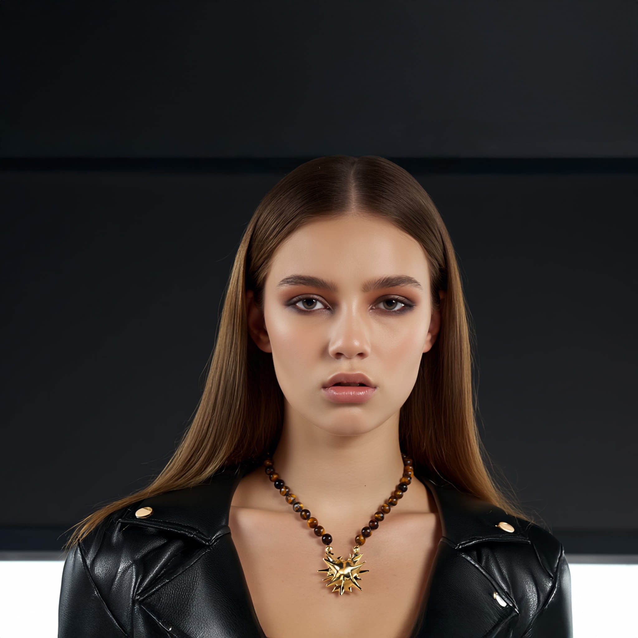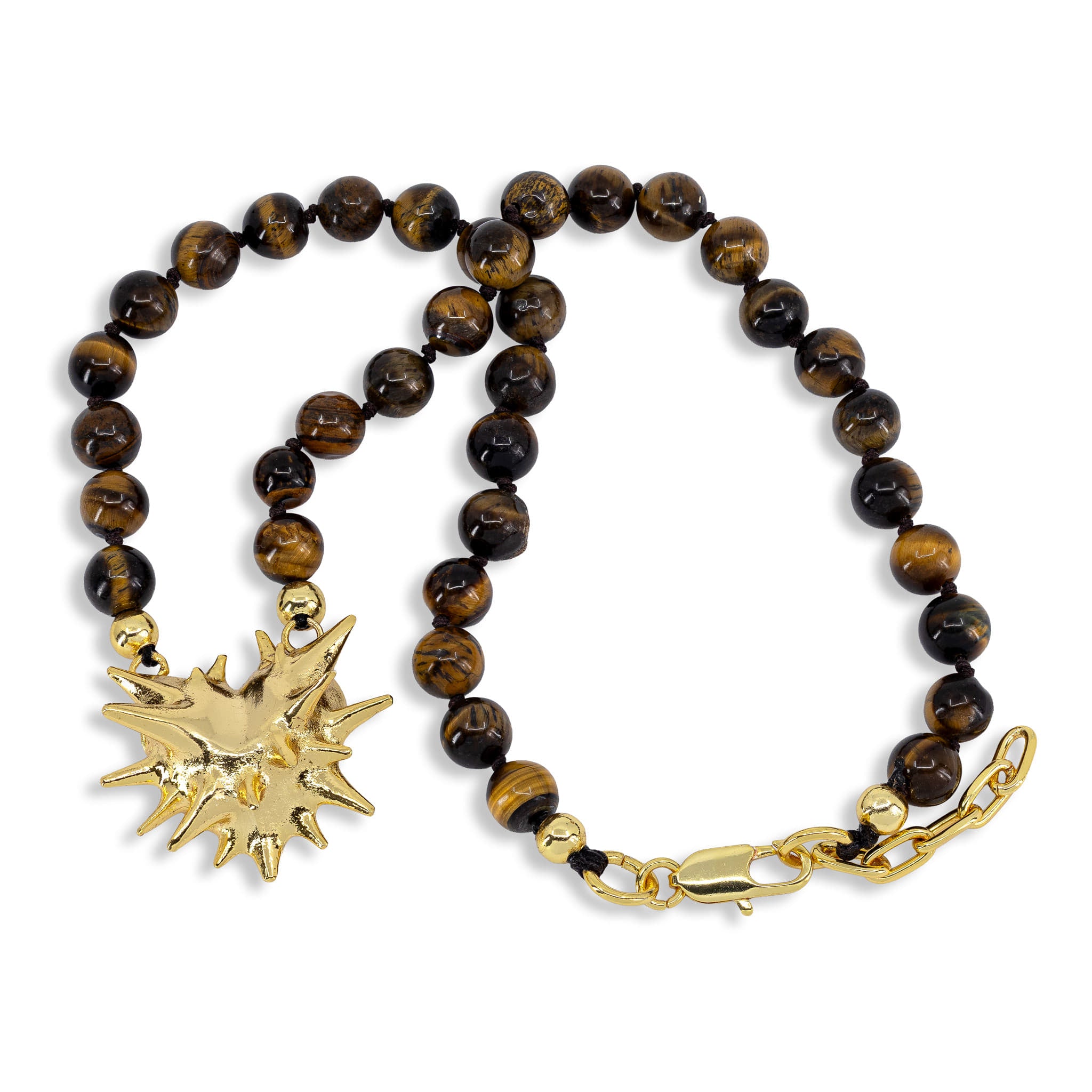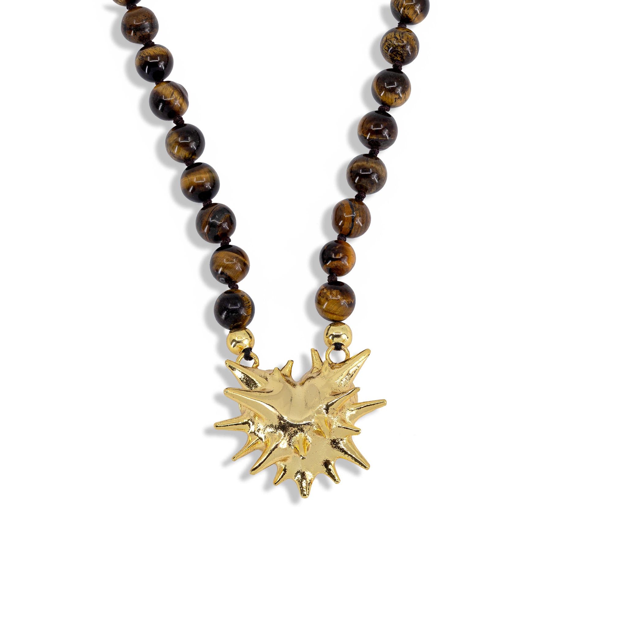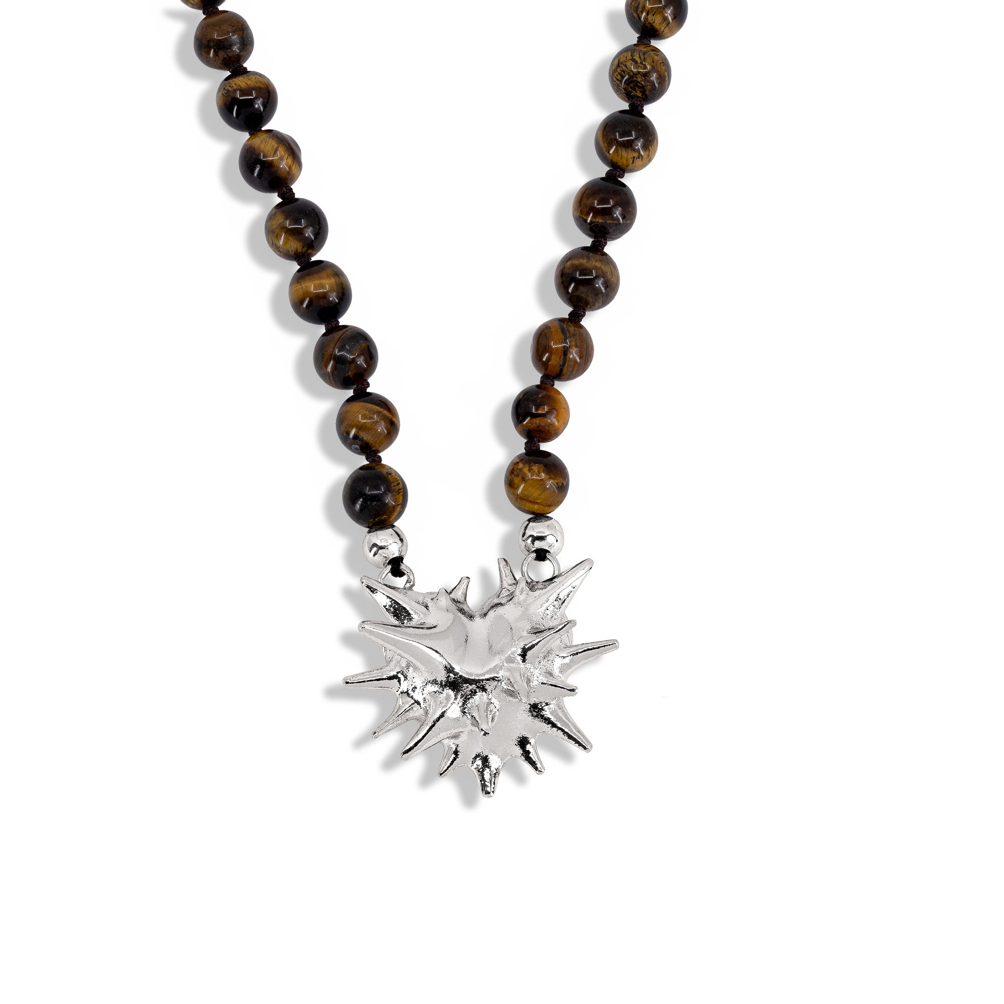 Kette mit Tigerauge-Perlen und mehrzackigem Spike-Anhänger aus Messing, in Silber oder Gold erhältlich – markantes Statement mit Struktur.