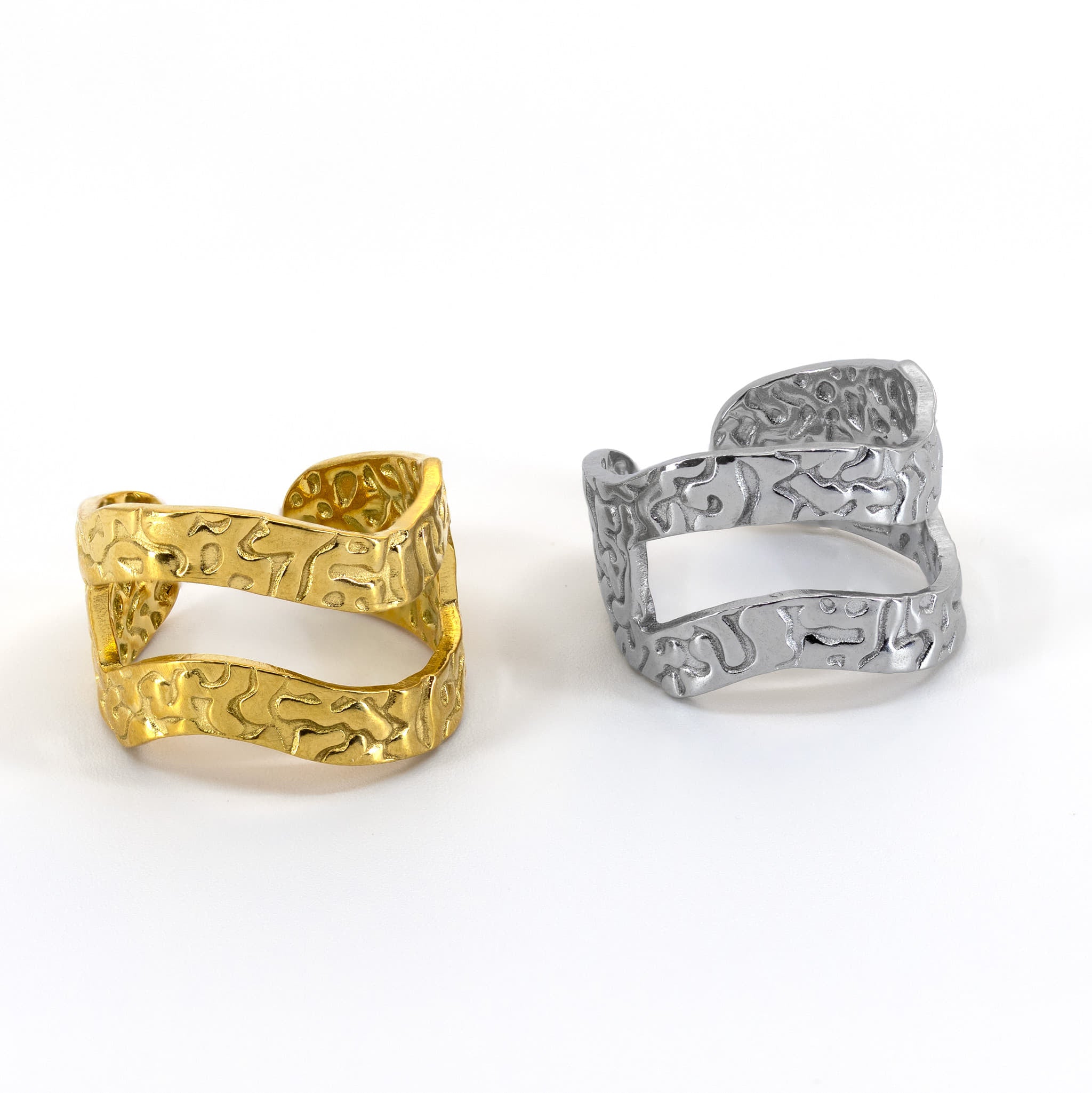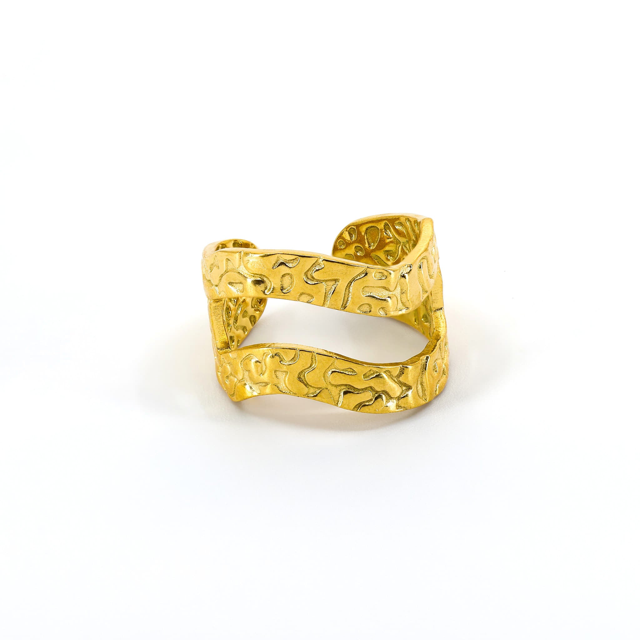 Breiter Ring aus Edelstahl im Wellen-Design, wahlweise in Silber oder mit 18k Vergoldung. Offenes, verstellbares Design – modern und stilvoll.