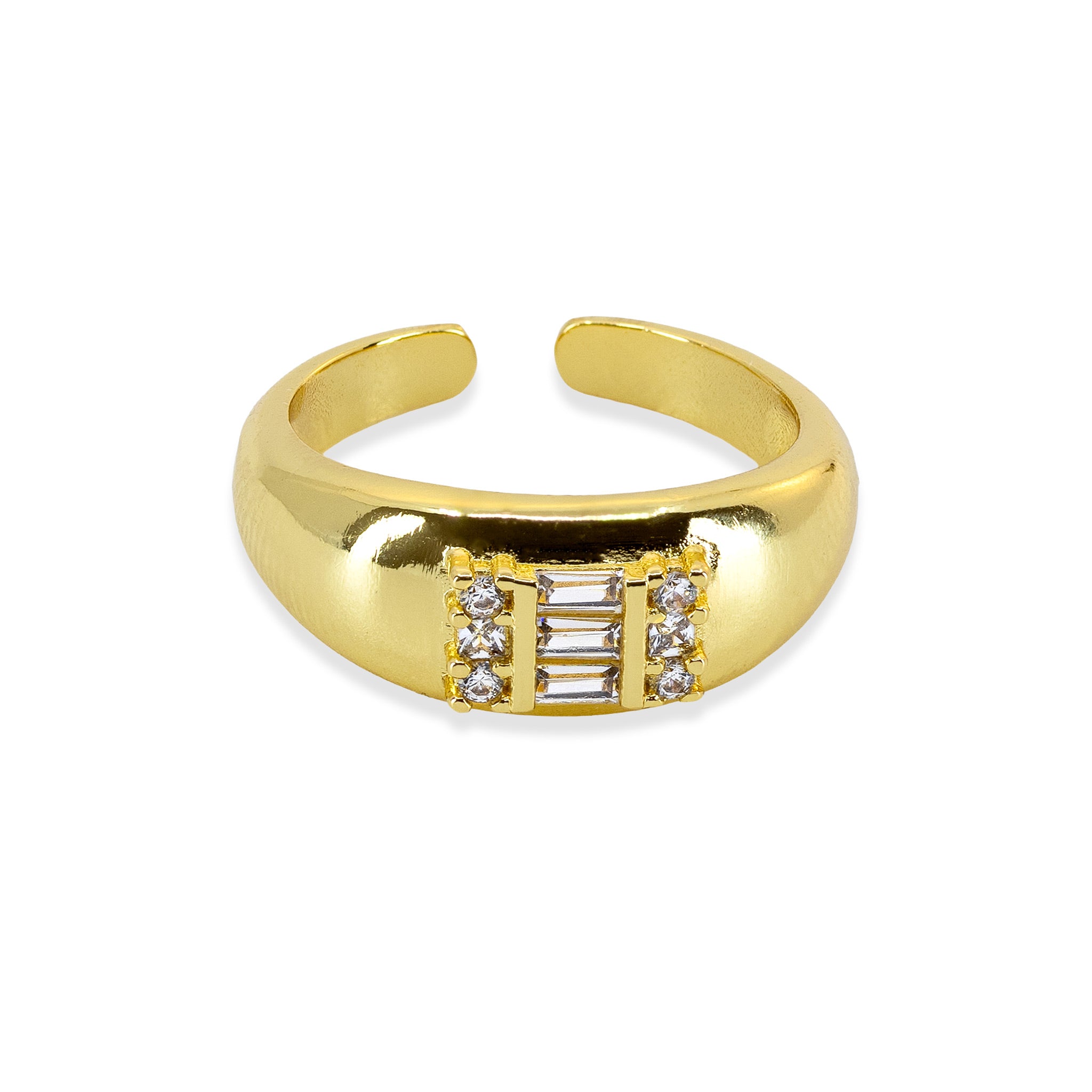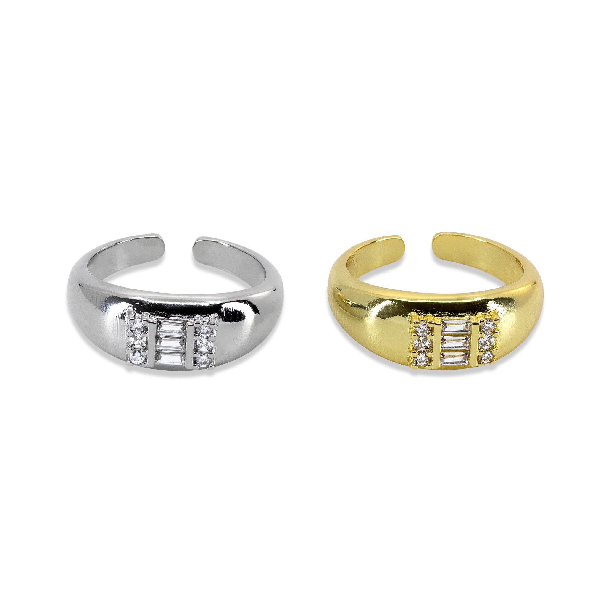 Ein moderner Statement-Ring mit klarer Linienführung und funkelnden Zirkonia-Steinen im rechteckigen Schliff. Das offene Design lässt sich individuell an den Finger anpassen und sorgt für einen eleganten, zugleich markanten Look. Erhältlich in 18K vergoldeter oder silberfarbener Ausführung – ein vielseitiges Schmuckstück mit moderner Raffinesse.
