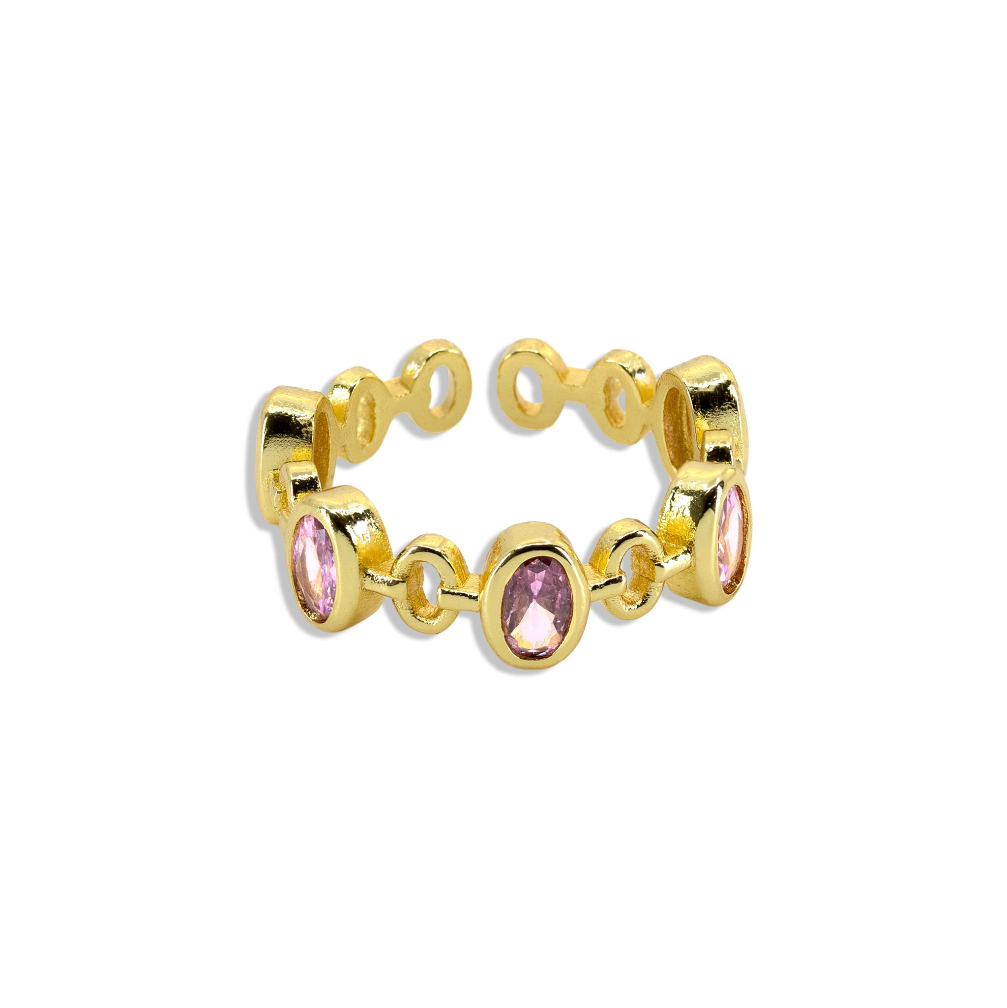 Ring mit runden rosa Schmucksteinen im Fassungs-Design, aus Messing mit 18k Vergoldung oder in Silber. Offen und verstellbar – modern, elegant und individuell tragbar.