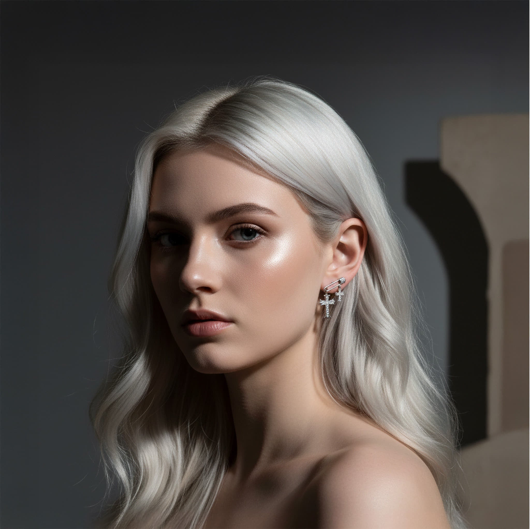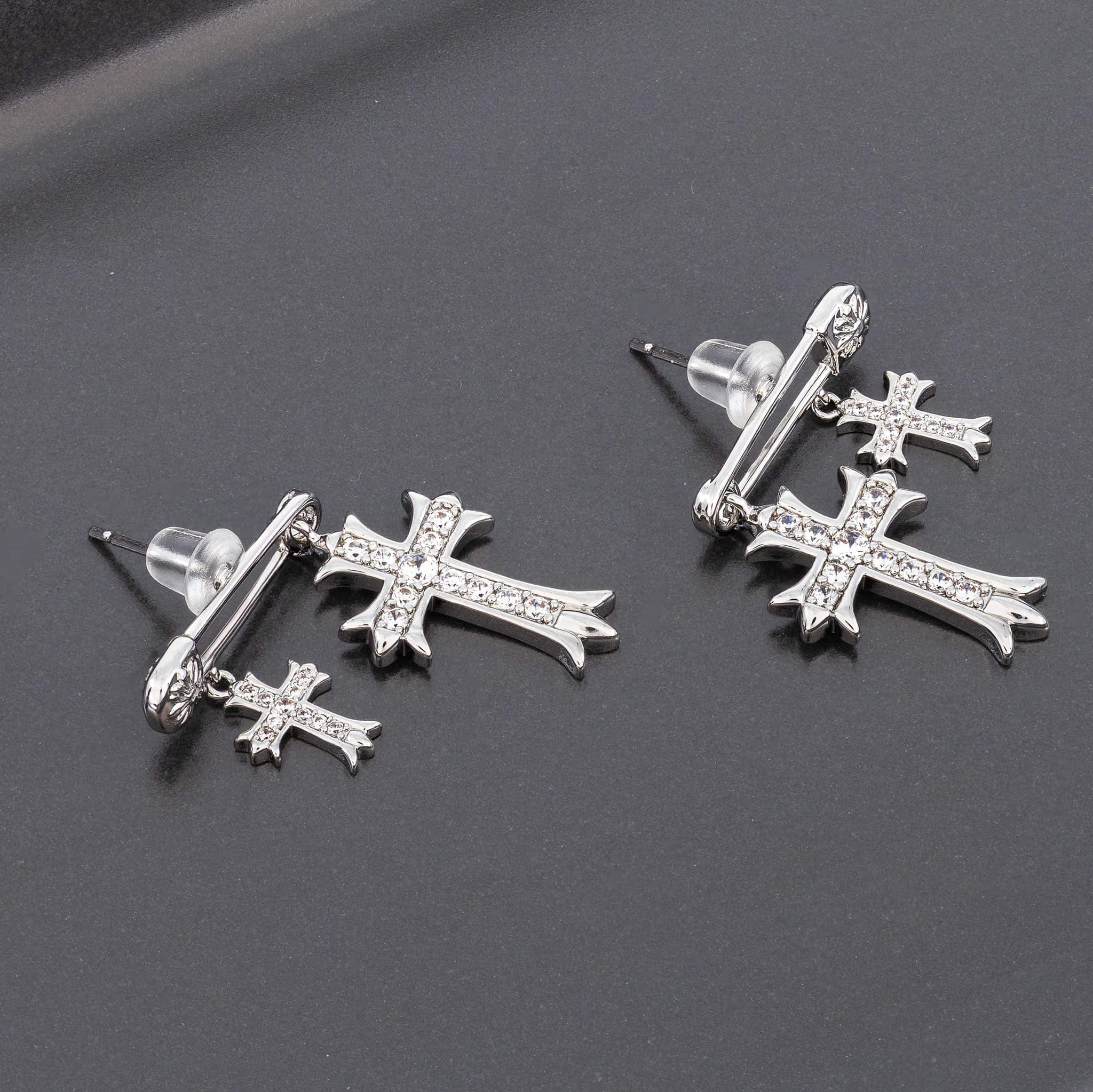 Diese Ohrringe setzen auf ein starkes, modernes Design mit zwei Kreuzanhängern, die dem Look einen coolen, charaktervollen Touch geben. Die Zirkonia sorgen für ein klares, elegantes Funkeln, ohne den Stil zu überladen. Gefertigt aus silberfarbenem Messing, verbinden sie Alltagstauglichkeit mit einem ausdrucksstarken Finish. Ein Statement-Piece, das jedes Outfit mühelos aufwertet – minimal, modern und auffällig zugleich.